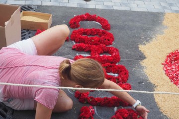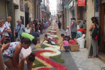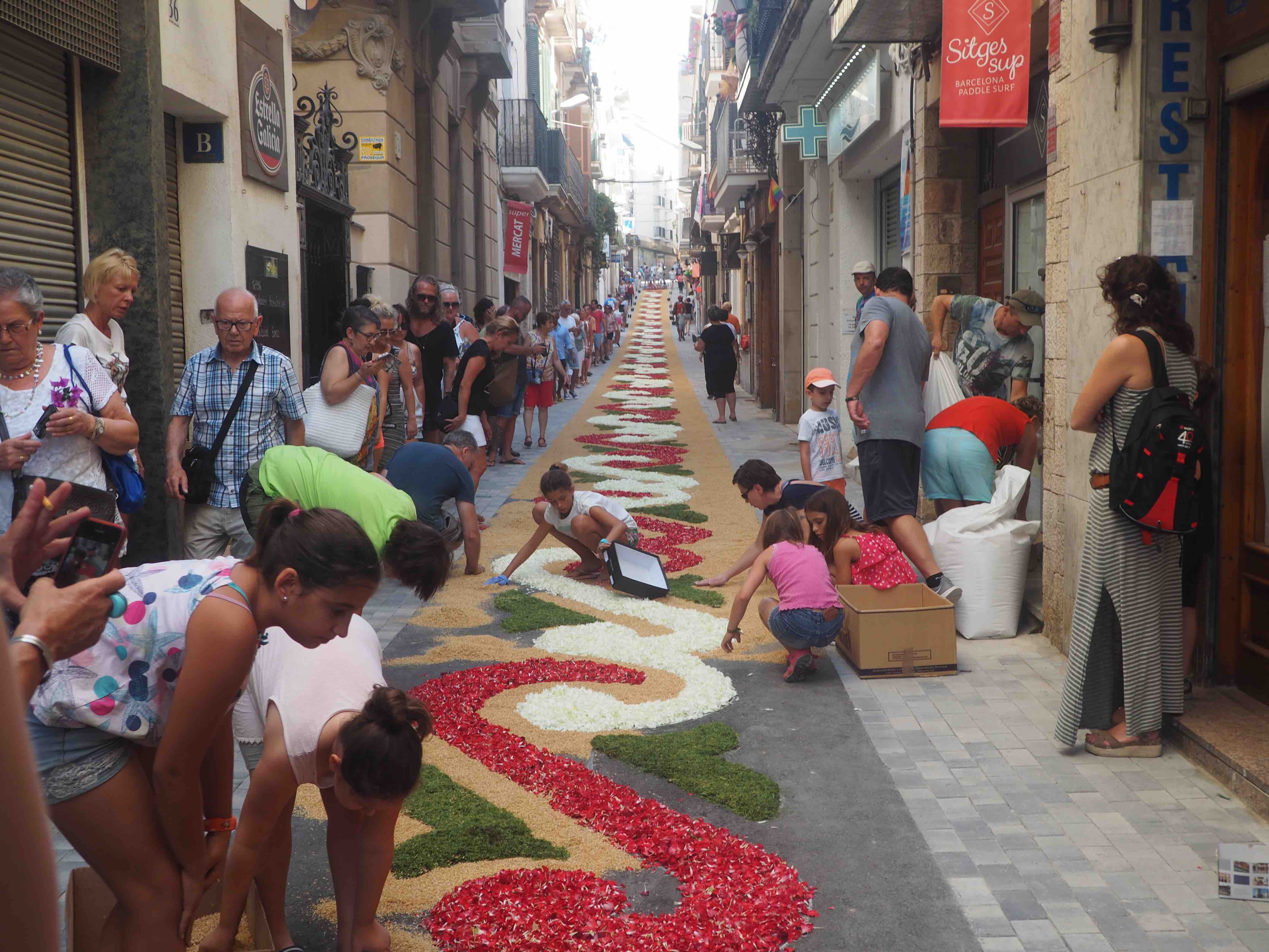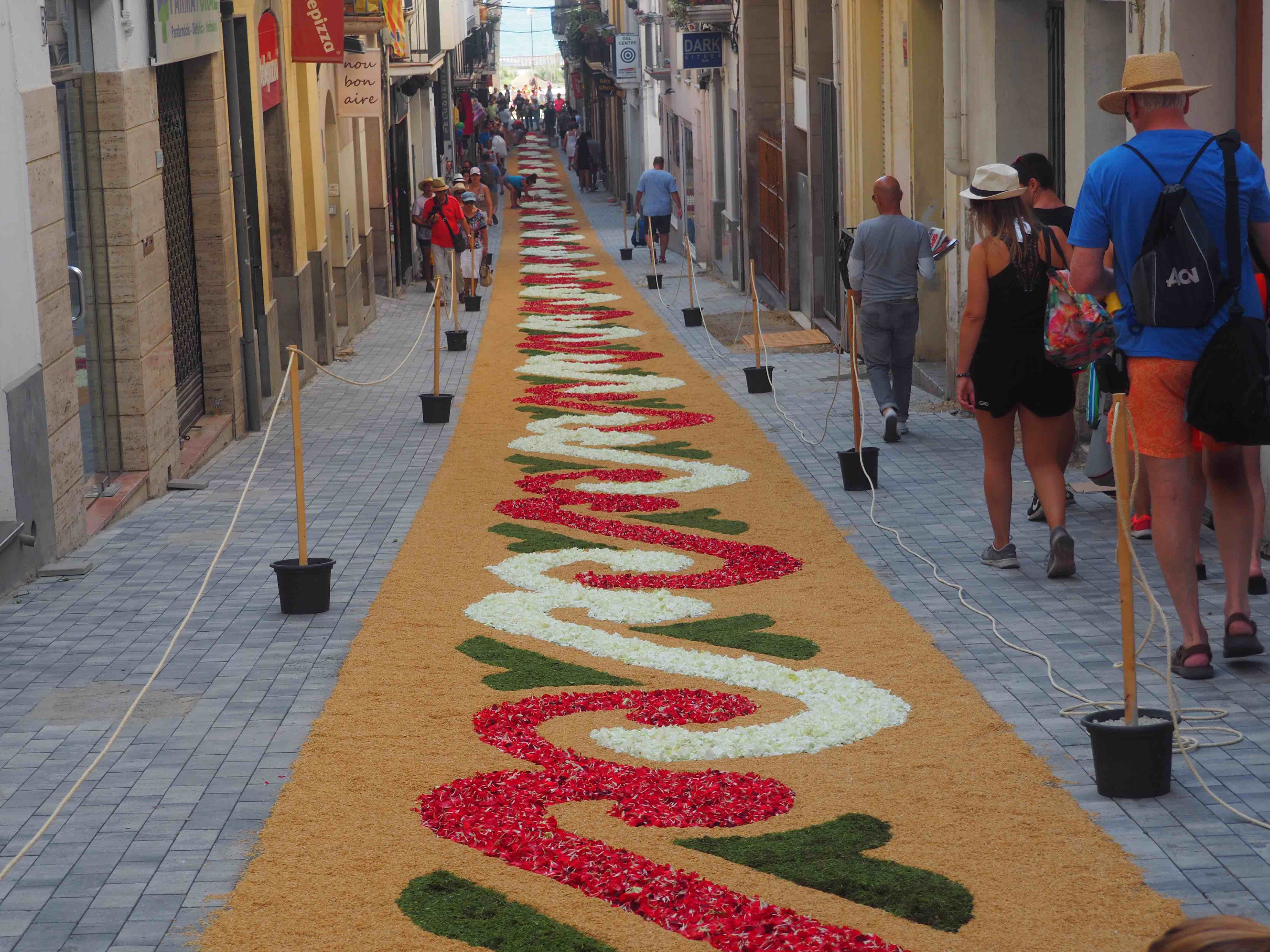 In Sitges the streets are transformed with murals made out of flowers, bringing a colorful atmosphere. Early in the morning the flowers are being installed (there is also a small competition for the best flower mural) and around 8 pm the religious ceremony starts. The ceremony includes a typical Spanish band and giant wooden structure known as “gegants” and serves as head of the blessed sacraments.