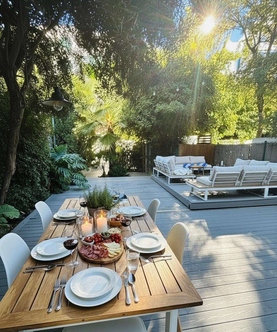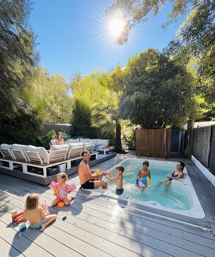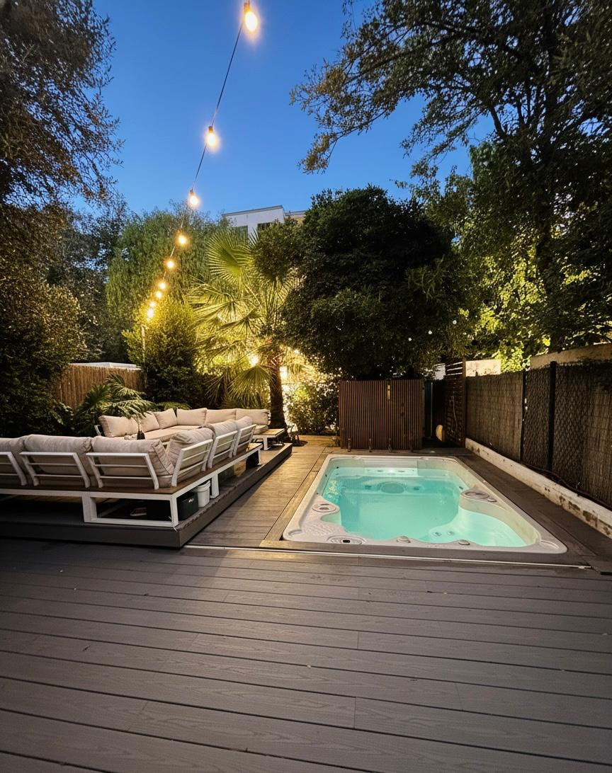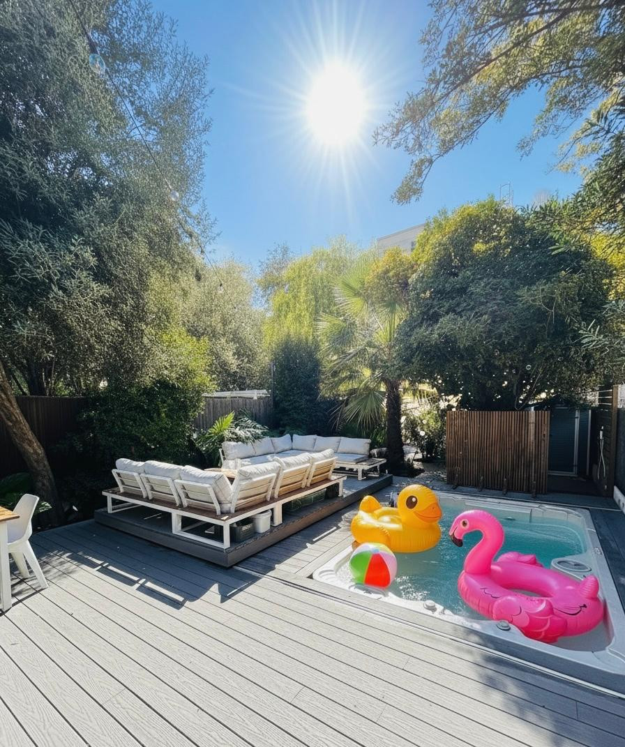 On either side of the hall, there are two additional double bedrooms, each with private en-suites and windows offering serene back terrace views. Step outside to discover a spacious decked terrace, complete with an outdoor BBQ kitchen area and a dining table for those delightful barbecue evenings. Unwind on the comfortable large sofa with a good book, while the sliding decking reveals a stunning, warm seated pool/jacuzzi, perfect for relaxation.