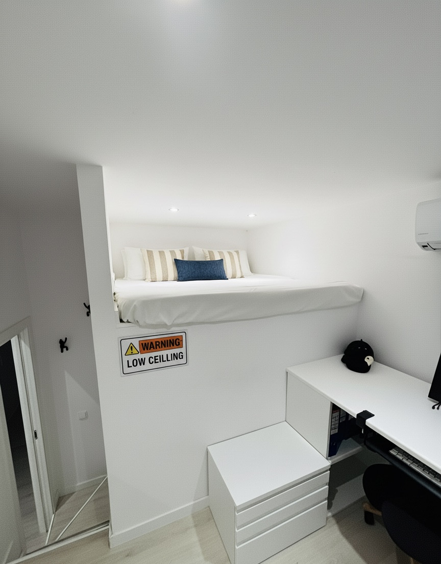 The first bedroom is an internal one with double sofa bed and en-suite shower room. Nestled within this room, a charming mezzanine with two double mattresses (ideal for small children) invites little ones to snuggle in. As you continue down the hall, you'll find a separate WC and a laundry room complete with a washer and dryer. A few more steps lead to a small internal office area featuring an en-suite and another mezzanine double mattress with a low ceiling, perfect for kids.